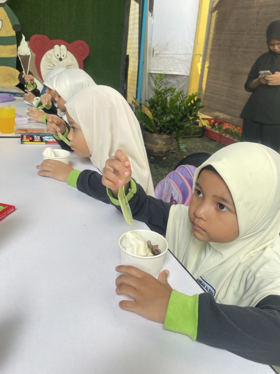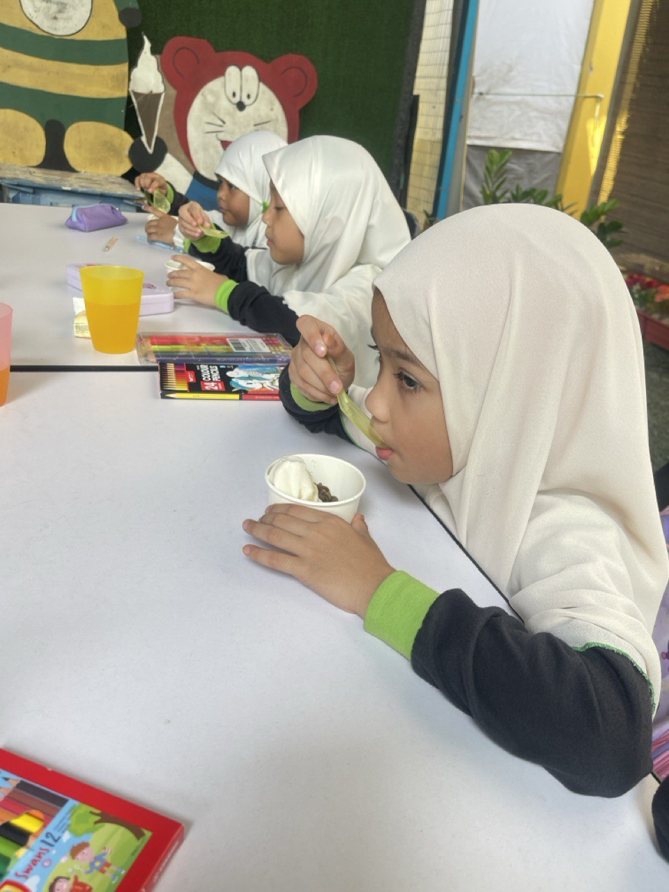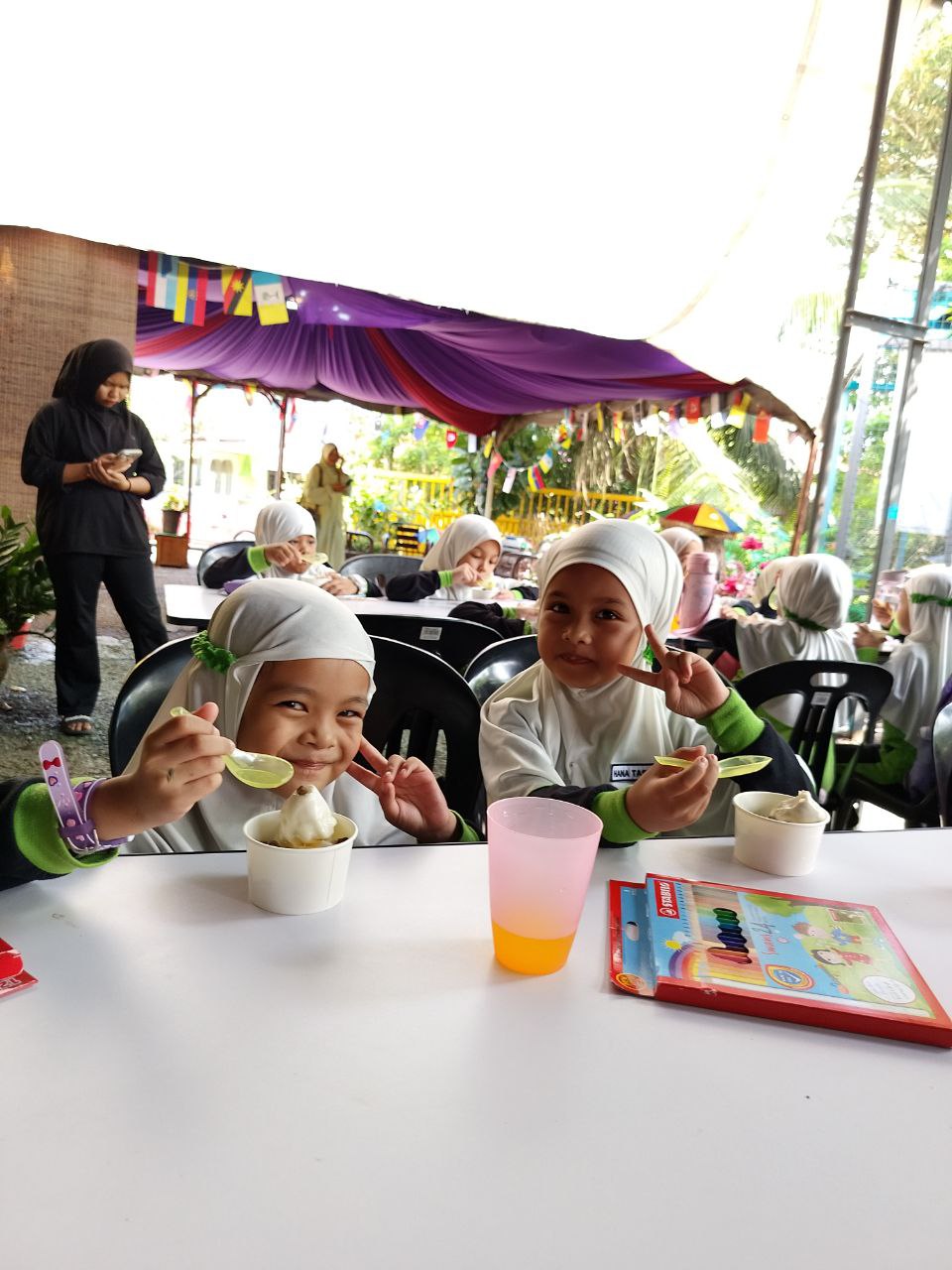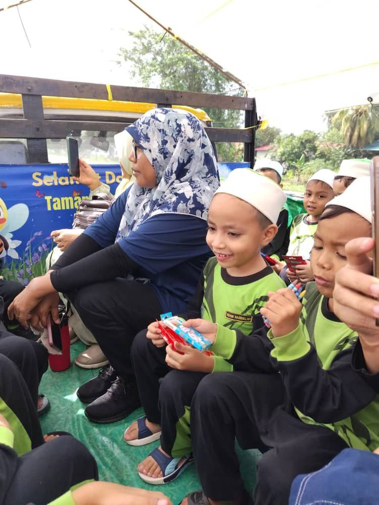 turut memberikan cenderahati kepada setiap pelajar dan juga memberi makan aiskrim madu.